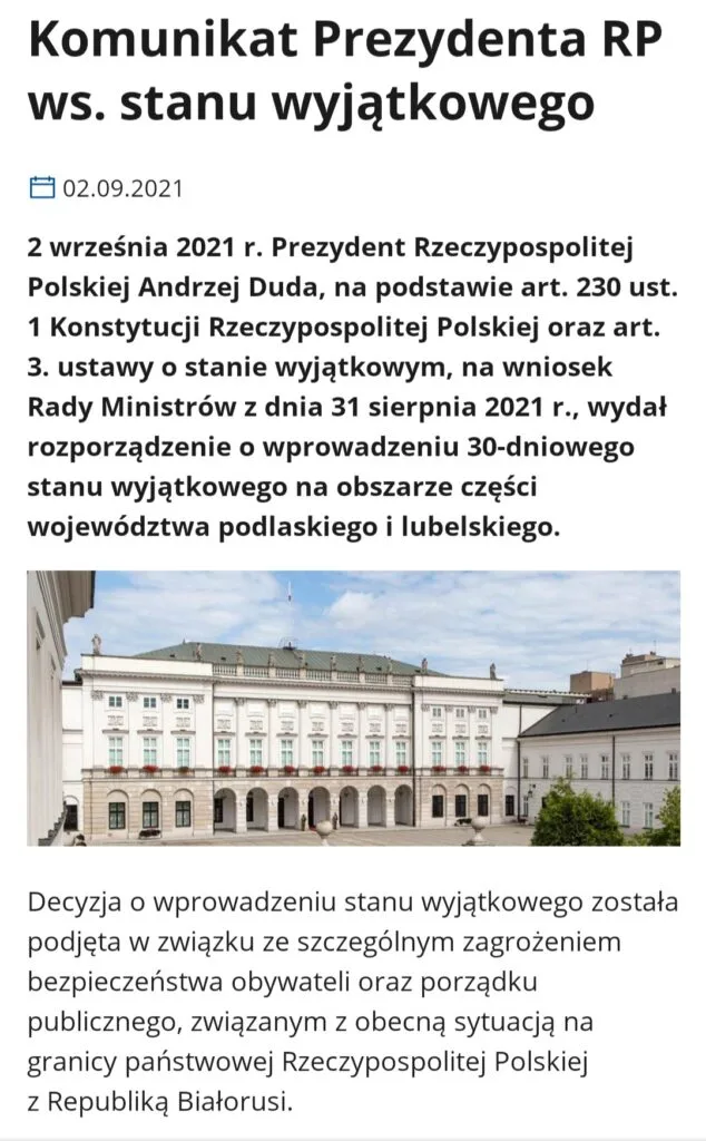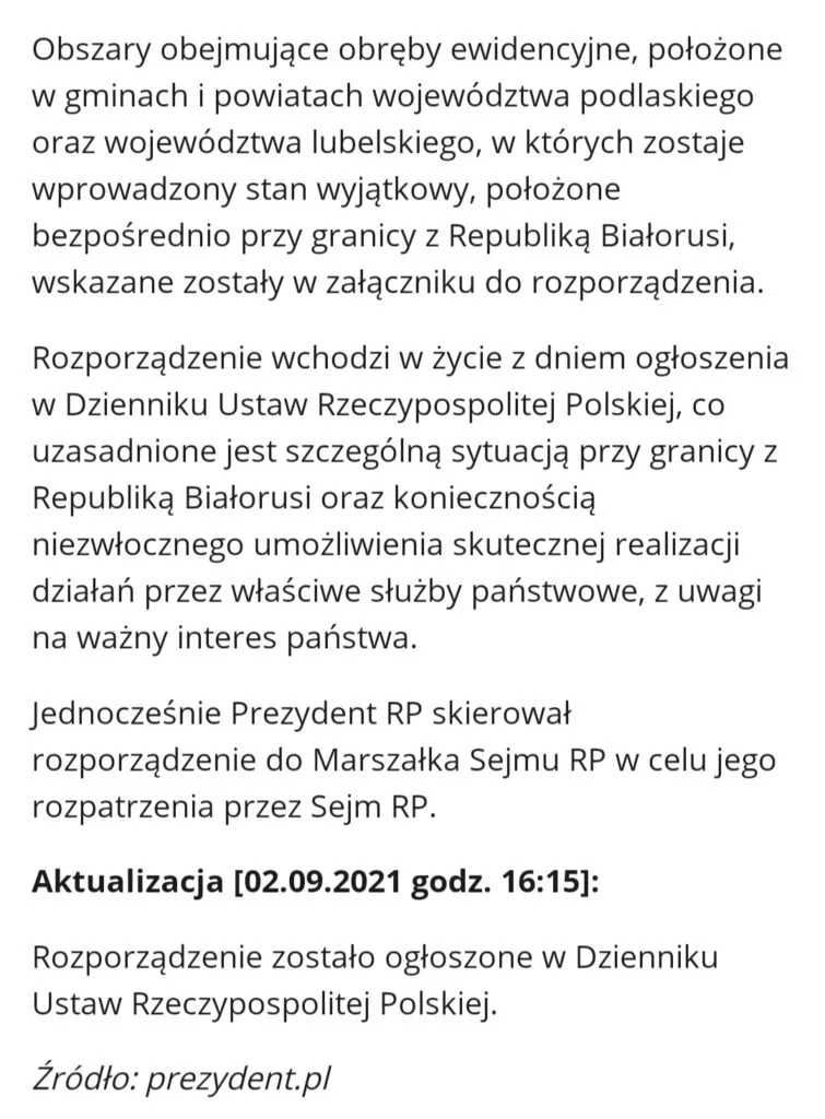 W Dzienniku Ustaw ukazało się już Rozporządzenie Prezydenta RP Andrzeja Dudy dotyczące wprowadzenia z dniem 02.09. 2021, 30- dniowego stanu wyjątkowego na obszarze części województw podlaskiego oraz lubelskiego.