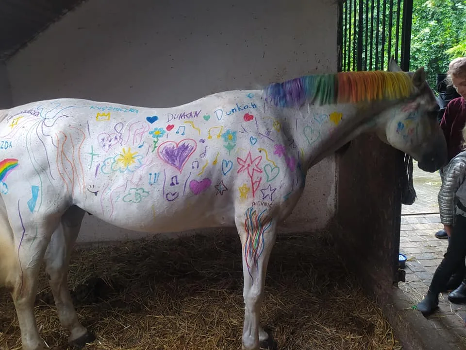 Mam mieszane uczucia. Zawsze miałam świadomość, że zwierzęta się pielęgnuje, myje, karmi, tuli, głaszcze i dba o nie jako symbol swojej miłości, budowania więzi. Skoro Państwo to robią, to po co wystawiać konia jako żywe płótno dla dzieci? Czy taka jest rola konia? Pracuje jako plastyk z dziećmi, jestem elastyczna i kreatywna w swoich metodach, ale na taką formę ekspresji nigdy bym nie pozwoliła.