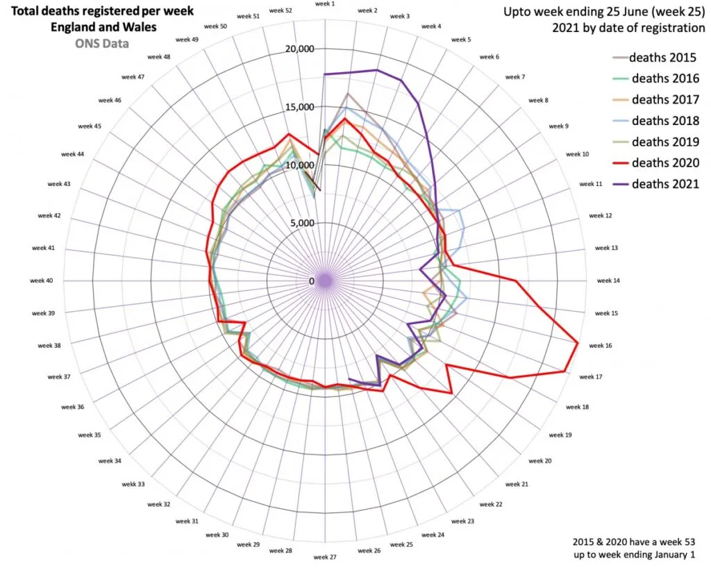 Liczba zgonów zarejestrowanych w Anglii i Walii w 25 tygodniu, kończącym się 25 czerwca 2021 r. wyniosła 8690.