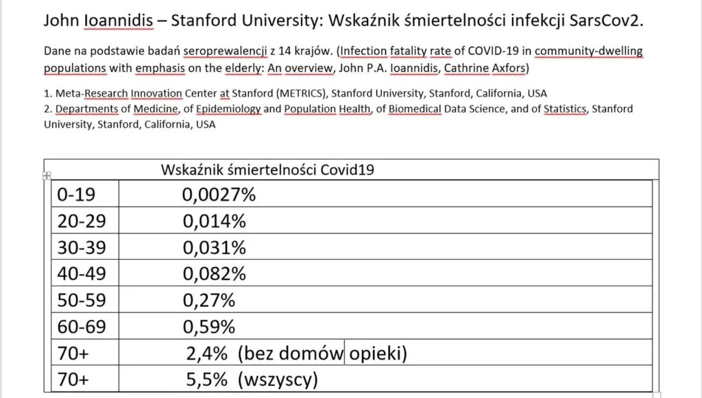 (Infection fatality rate of COVID-19 in community-dwelling populations with emphasis on the elderly: An overview, John P.A. Ioannidis, Cathrine Axfors)1. Meta-Research Innovation Center at Stanford (METRICS), Stanford University, Stanford, California, USA2. Departments of Medicine, of Epidemiology and Population Health, of Biomedical Data Science, and of Statistics, Stanford University, Stanford, California, USA.