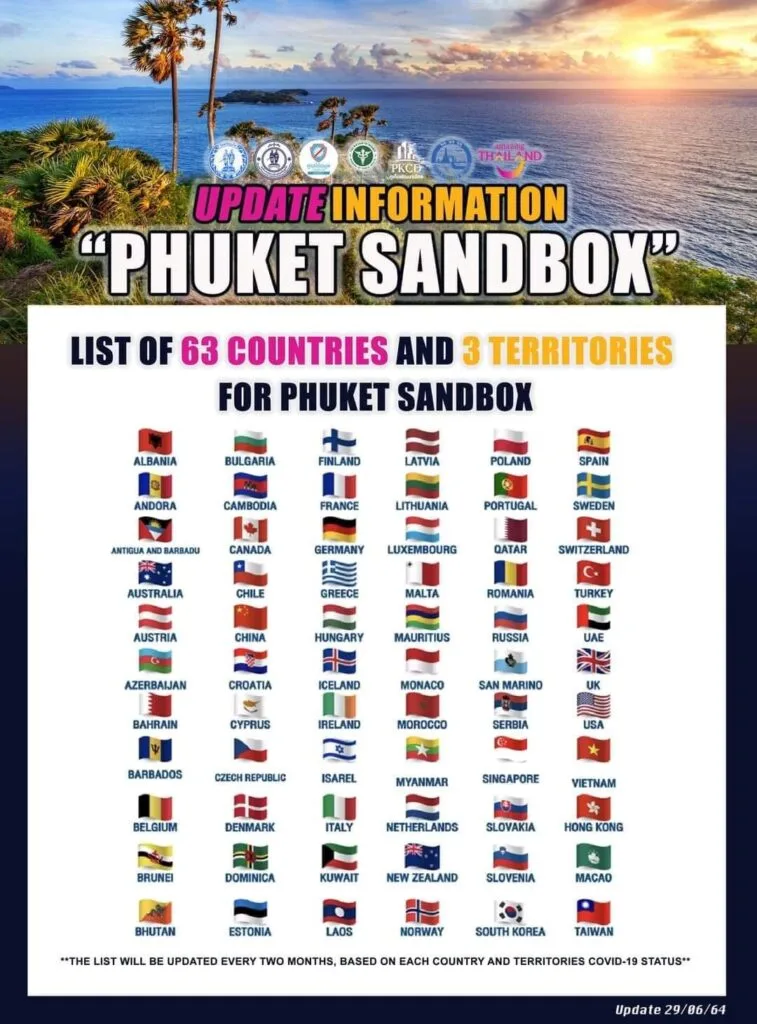 Podróżować z kraju niskiego lub średniego ryzyka zgodnie z kryteriami określonymi przez Ministerstwo Zdrowia Publicznego i Urząd Turystyki Tajlandii. W przypadku podróży z innych krajów należy przebywać w kraju określonym powyżej przez co najmniej 21 dni przed wjazdem do Phuket.