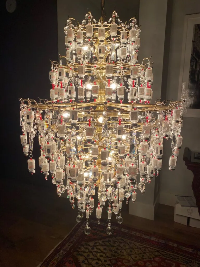Żyrandol stworzyła Laura, pielęgniarka ze Stanów Zjednoczonych zadziwiając internautów swoją kreatywnością. Żyrandol składa się z kilku warstw i oprócz pustych fiolek ozdobiony został kryształkami dzięki czemu lśni jak ze sklepu.