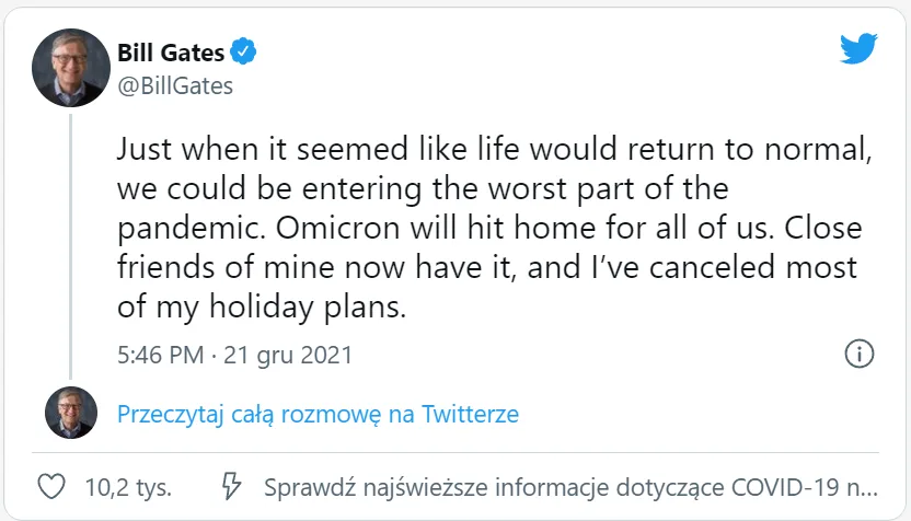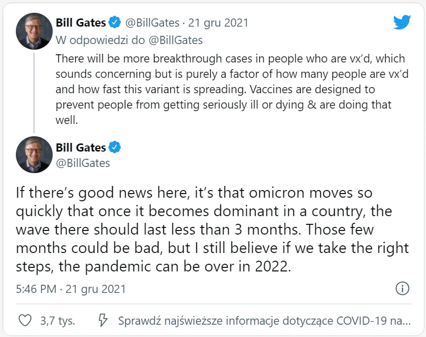 Gates dodał, że Omicron porusza się tak szybko, że gdy zdobędzie dominację w kraju, fala powinna trwać krócej niż 3 miesiące. „Te kilka miesięcy może być złych, ale nadal wierzę, że jeśli podejmiemy właściwe kroki, pandemia może się skończyć w 2022 roku” – napisał w tweecie.