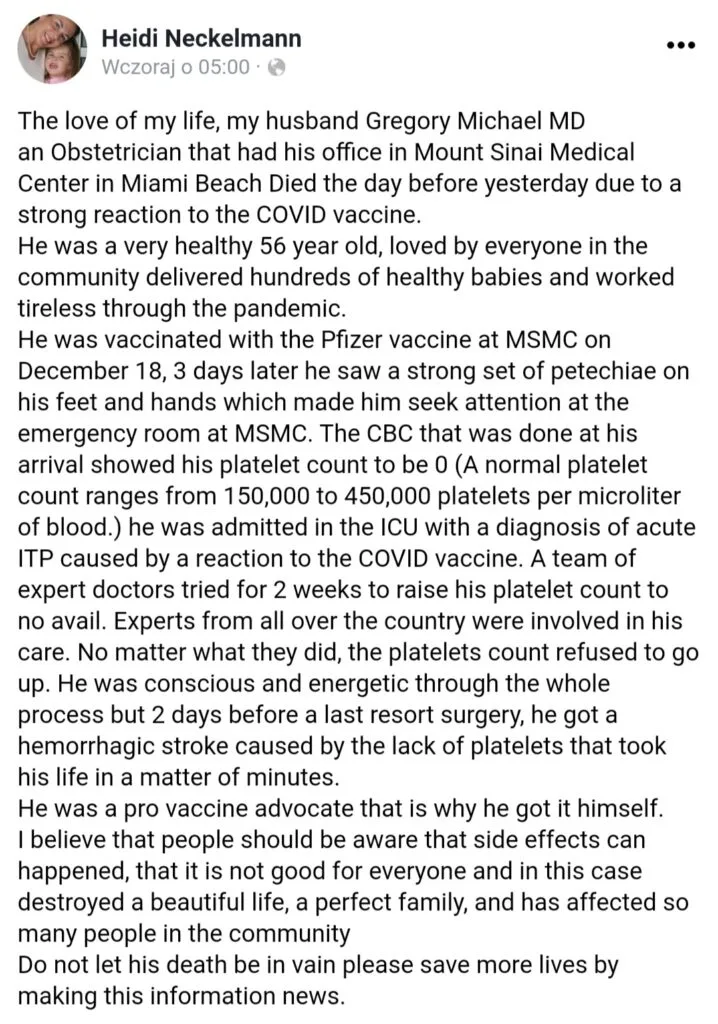 Miłość mojego życia, mój mąż Gregory Michael MD położnik, który miał swój gabinet w Mount Sinai Medical Center w Miami Beach zmarł przedwczoraj z powodu silnej reakcji na szczepionkę przeciwko Covid. Był bardzo zdrowym 56- latkiem, kochanym przez wszystkich w społeczeństwie, setki zdrowych dzieci i pracował niestrudzony przez pandemie.